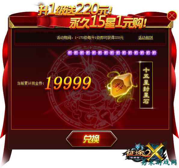 活动期间,1—170级的玩家,每升1级即可获得220元现金券!达到170级,玩家可以累计高达37400元的现金券巨奖!可以用来购买游戏中所需的各类道具,包括战力提升道具。还可1元购永久15星封星石,真是福利大开,惊喜临门! 10星!12星!13星!14星封星石!使用1元现金券就能获得!《征途2X》福利大放送,人人都能享受超级大利好!