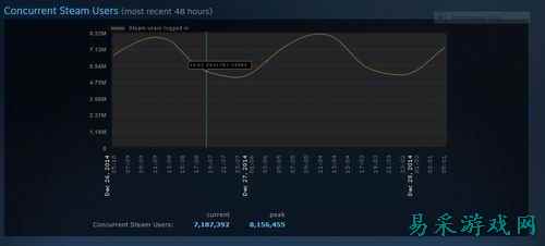 【52PK 12月29日消息】就在PSN和Xbox Live在DDoS攻击之下叫苦连天的时候,Valve旗下平台Steam在用户数量上却悄悄突破了新纪录。昨天,Steam的同时在线用户数突破了800万,再次证明了这个数字平台有多受欢迎。 在下方的图表中可以看到,Steam的在线用户数达到了8156455人。这也是迄今为止我们看到的最高在线用户数,不知达成一千万的目标需要多长时间。