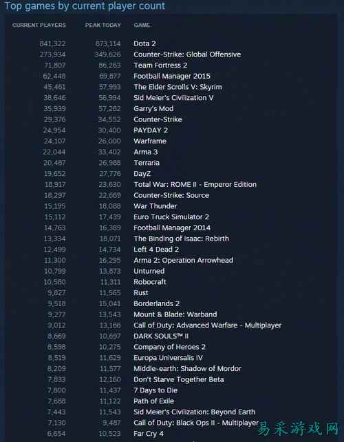 另外,我们可以看到《DOTA 2》和《反恐精英:全球攻势》是当前平台上最受欢迎的游戏。还有就是《上古卷轴5:天际》依然威风不减,而《武装突袭3》也比3A级大作《孤岛惊魂4》和《使命召唤11:高级战争》要更加流行。