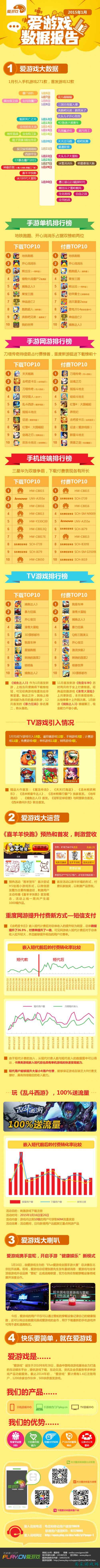 2015年2月15日,爱游戏发布2015年1月数据报告。 1月份爱游戏引入手机游戏271款,其中首发游戏32款。引入TV游戏15款,遥控器游戏12款,手柄游戏3款;计费游戏11款,免费游戏4款;单机游戏11款,网络游戏4款。单机排行榜中,地铁跑酷和开心消消乐占据双榜前两位,单机仍是老牌经典游戏的天下。网游排行榜中,刀塔传奇持续霸占付费榜首,征途、乱斗西游等重度新游挺进下载榜前十。 手机终端排行榜相比上月变化不大,三星华为双雄争霸,付费和下载表现各有千秋。1月份《喜羊羊快跑》预热活动“画羊贺年”上线,有效拉升游戏首发后的营收。重度卡牌游戏《去吧皮卡丘》嵌入短代计费,付费率和游戏收入明显提升,证明短代计费对增加重度网游收入有显著效果。《乱斗西游》开展送流量活动,下载用户数、新增注册用户数远超其它网游。在1月16日的金鹏奖颁奖典礼上,爱游戏携手雷蛇,开启“健康娱乐”新模式,双方将在智能穿戴设备领域展开深度合作。
