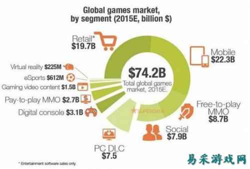 【52PK 5月22日消息】市场研究公司Superdata近日发布了一份标题为《2015年全球游戏市场报告》的最新数据报告,称2015年全球游戏市场收入规模预计将达742亿美元(约合4601亿元),还对不同平台游戏收入分布,以及市场未来发展趋势进行了解读。 与Newzoo等公司的预测数据相比(注:Newoo认为2015年全球游戏市场收入将达915亿美元),Superdata的预测略显保守。但这家公司也相信,在移动游戏和免费MMO的推动下,全球游戏市场将继续增长。2017年,全球游戏市场收入将达817亿美元,2018年则基本保持与 2017年相当的水平。