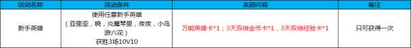 活动四:新手英雄 活动时间:4月27日-5月7日 活动规则及奖励: 使用任意新手英雄胜利,即可获得奖励。