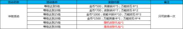 活动三:冲级活动 活动时间:4月27日-5月7日 活动规则及奖励: 活动期间,等级达到相应等级,即可获得相应奖励。