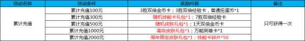 活动十三:累计充值 活动时间:4月27日-5月7日 活动规则及奖励: 活动期间,累计充值达到相应活动,即可获得相应奖励。