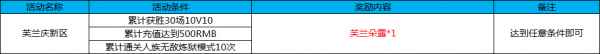 活动二:芙兰朵露庆新区 活动时间:4月27日-5月7日 活动规则及奖励: 活动期间,完成累计胜场,累计充值,人族无敌炼狱模式中任意条件,即可获得芙兰朵露