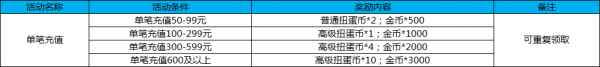 活动十一:单笔充值 活动时间:4月27日-5月7日 活动规则及奖励: 活动期间,单次充值达到相应活动,即可获得相应奖励。