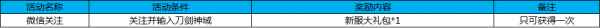 活动十五:微信关注 活动时间:4月27日-5月7日 活动规则及奖励: 活动期间,关注微信,并输入刀剑神域即可获得新服大礼包奖励。