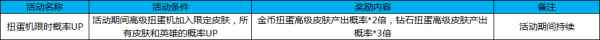 活动八:扭蛋机限时概率UP 活动时间:4月27日-5月7日 活动规则及奖励: 活动期间,高级扭蛋机加入限定皮肤,所有皮肤和英雄的概率UP!