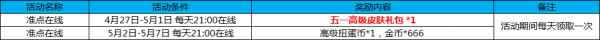 活动六:准点在线 活动时间:4月27日-5月7日 活动规则及奖励: 活动期间内每日准点在线,即可获得相应奖励。