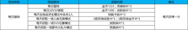 共有活动 活动五:每日登陆 活动时间:4月27日-5月7日 活动规则及奖励: 活动期间,每日登陆并完成相应活动,即可获得相应奖励, 5V5与大乱斗任务仅有老区可参与。
