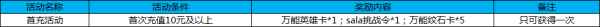 活动十:首充活动 活动时间:4月27日-5月7日 活动规则及奖励: 活动期间,首次充值达到10元以上,即可获得奖励。