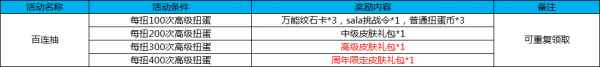 活动十二:百连抽 活动时间:4月27日-5月7日 活动规则及奖励: 活动期间,进行一百次以上扭蛋达到相应活动,即可获得相应奖励。