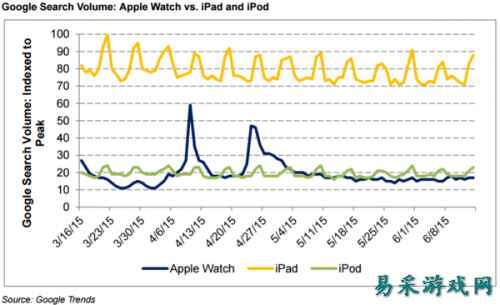 在此,也许有人会称,之前苹果Apple Watch的发布难道没有激发可穿戴设备市场吗?实际上自苹果Apple Watch上市以来,业内对其销量的预估是大相径庭。据市场研究公司Slice Intelligence最新的统计,自今年4月推出以来,Apple Watch的累计销量为279万只。如果照此计算的话,Apple Watch全年的出货量将远远低于此前摩根士丹利乐观的3600万。此外,据来自Pacific Crest 分析师通过谷歌搜索中用户对于Apple Watch、iPad 和iPod 的搜索量对比之后认为,用户对于Apple Watch 的兴趣正在消退,其关注度甚至低于苹果近乎“死亡”的产品线—iPod。