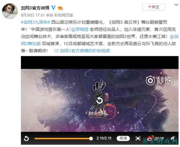 再说回剑网3九周年主推的文化衍生,动漫影视是一方面,舞台剧也安排上了。 舞台剧《剑网3·曲云传》计划10月在成都锦城艺术宫进行首次利用黑科技来还原剑网3的大美江湖。