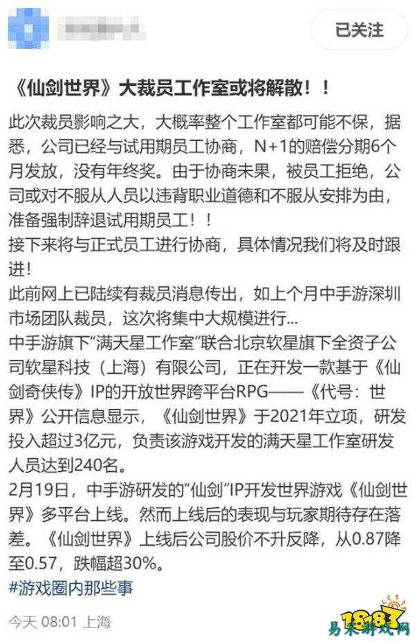 过河拆桥?!曝《仙剑世界》工作室即将迎来大裁员!官方承诺不会影响游戏!