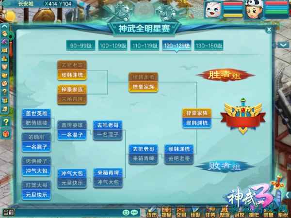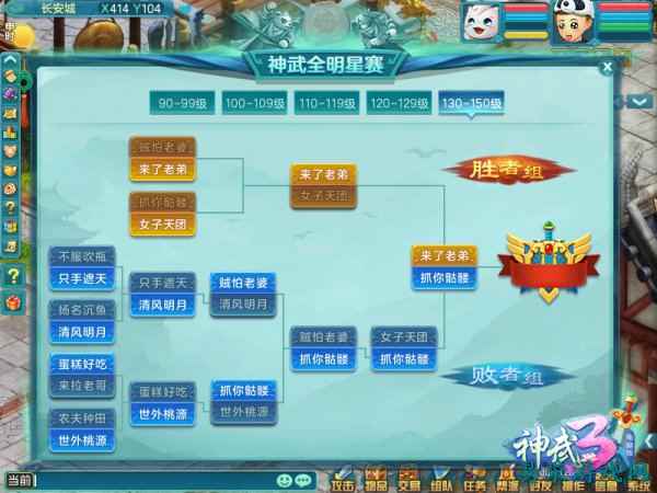 群雄争霸,决战鹏城!1月5日至1月6日,《神武3》电脑版第六届排位赛全明星线下总决赛即将在“鹏城”深圳正式打响。来自全服五大分级段、十支顶尖PK战队汇聚于此,向各分级段总冠军的至高荣耀发起最后冲击。 新服推荐:“飞鸿踏雪”、“锦瑟年华” 龙争虎斗 120至150分级段总决赛入围名单出炉 从2018年12月28日19时第一场预选赛正式开战,到2018年12月30日17:45败者组决赛精彩落幕,历经三天艰苦厮杀,《神武3》第六届排位赛全明星120至150级分段总决赛入围名单火热出炉—— 120至129级分段,胜者组“梓豪家族”战队一路过关斩将,胜者组第二轮淘汰赛55回合战胜“缪韩渊梳”战队,率先晋级;“缪韩渊梳”战队以“强龙”姿态入主败者组,35回合力挫表现抢眼的“去吧老哥”战队,与“梓豪家族”再度会师总决赛,其坚韧的逆境防守战术、利落的顺境突破能力堪称不凡。