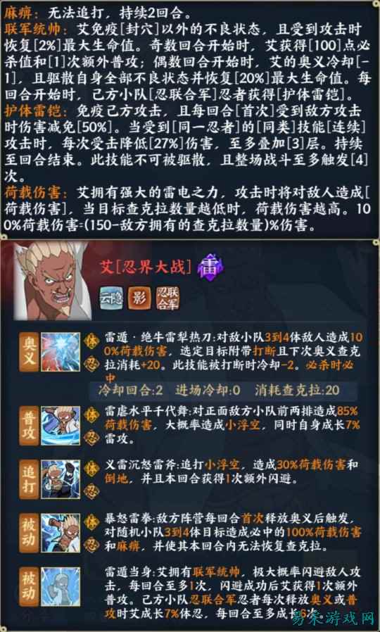 艾是雷之国云隐村的四代目雷影,三代目雷影之子,也是八尾人柱力奇拉比的义兄。 虽然性格暴躁冲动,但实力非常强大,他将雷遁查克拉模式磨练得十分熟练,全身在“雷遁护体”的保护下,速度和防御力都堪称强劲,而且惊人的速度能够媲美波风水门的“飞雷神之术”,艾的速度之快犹如蓝色闪电! ![]() 第四次忍界大战开启之后,艾作为忍联合军的统帅坐镇总部,直至宇智波斑现身,艾与纲手凭借“天送之术”抵达前线,并在大野木的配合下首次正面击破斑的须佐能乎。 ![]() 如今,《火影忍者:忍者新世代》中,艾[忍界大战]强忍降临!就让我们一起看看他在游戏中能给我们带来怎样强势的表现吧! ![]() 一、忍者简析: ![]() 奥义:雷遁·绝牛雷犁热刀:对敌小队3到4体敌人造成100%荷载伤害,选定目标附带打断且下次奥义查克拉消耗+20。此技能被打断时冷却-2。必杀时必中。 Tip:伤害不俗,缺点是必杀时才能必中,以及奥义不算永动,除了首回合以外的奇数回合会有真空期,但通过增加对方奥义查克拉消耗来限制其主动性,在当前环境中的效果也非常不错。 ![]() 普攻:雷虐水平千代舞:对正面敌方小队前两排造成85%荷载伤害,大概率造成小浮空,同时自身成长7%雷攻。Tip:群体伤害普攻,伤害系数较高,而且还有属性攻的养成,简单粗暴的普攻技能。 追打:义雷沉怒雷斧:追打小浮空,造成30%荷载伤害和倒地,并且本回合获得1次额外闪避。 Tip:生存型追打,额外获得的闪避能提高艾的生存能力。 被动Ⅰ:暴怒雷拳:敌方阵营每回合首次释放奥义后触发,对随机小队3到4体目标造成必中的100%荷载伤害和麻痹,并使其本回合内无法恢复查克拉。 Tip:随机3到4体目标,有一定随机性,但是对很多能恢复查克拉的忍者有不错的克制效果,而且附带的麻痹效果,也能针对部分主角和忍者。 被动Ⅱ:雷遁当身:艾拥有联军统帅,极大概率闪避敌人攻击,每回合至多1次,闪避成功后艾获得1次额外普攻。己方小队忍联合军忍者每次释放奥义或普攻时艾成长7%体忍,每回合至多成长6次。 Tip:该被动技能兼顾了输出和防守的效果,在忍联标签队友的配合下,艾每回合最高能养成42%体忍,还是相当可观的,同时联军统帅提供的效果也非常强势。 特殊词条: 麻痹:无法追打,持续2回合。 联军统帅:艾免疫[封穴]以外的不良状态,且受到攻击时恢复[2%]最大生命值。奇数回合开始时,艾获得[100]点必杀值和[1]次额外普攻;偶数回合开始时,艾的奥义冷却[-1],且驱散自身全部不良状态并恢复[20%]最大生命值。每回合开始时,己方小队[忍联合军]忍者获得[护体雷铠]。 护体雷铠:免疫己方攻击,且每回合[首次]受到敌方攻击时伤害减免[50%]。当受到[同一忍者]的[同类]技能[连续]攻击时,每次受击降低[27%]伤害,至多叠加[3]层。持续至回合结束。此技能不可被驱散,且整场战斗至多触发[4]次。 荷载伤害:艾拥有强大的雷电之力,攻击时将对敌人造成[荷载伤害],当目标查克拉数量越低时,荷载伤害越高。100%荷载伤害=(150-敌方拥有的查克拉数量)%伤害。 忍者定位:普攻输出、联军辅助 推荐饰品:猿王、玄龟、赤晶、翠玉套装 ![]() 二、搭配思路: 1、结合艾[忍界大战]的技能特点,一图流搭配推荐: ![]() 2、与艾[忍界大战]搭配阵容忍者的优点: (1)宇智波佐助[侠客列传]是雷、火双属性忍者辅助,能提升雷属性额外普攻、火属性追打次数,自身不仅拥有全体清除一层异常的效果外,自身输出能力同样不俗; (2)奇拉比[尾兽化]是雷属性的普攻输出忍者,能进行多次普攻,并触发高伤害被动; (3)奥摩伊可根据己方雷属性忍者数目提升忍体属性,新区的全能型忍者,性价比较高; (4)达鲁伊能为小队提供水攻、雷攻加成,并为水、雷忍者增加额外普攻; (5)大野木[忍界大战]能养成己方联军角色,可降低对方防御,增加小队普攻次数,每回合可减免伤害,并让拥有护盾的角色免疫追打,被动还能限制全场奥义; (6)千手柱间[和服]能为满足站位条件的忍者提供属性加成以及免伤次数,分身可恢复查克拉,自身奥义还有用专注以及限制敌方奥义等优秀效果; (7)佐井[忍界大战]拥有联军标签,可增加奥义冷却,还能限制敌方普攻,面对普攻流阵容有不错的效果;(8)宇智波鼬[绛月之侍]可造成特效“转写灵印”,使下次行动失效,降低查克拉消耗,一回合最多可释放两次奥义;(9)照美冥[忍界大战]能辅助忍联合军标签忍者增加大量体忍,降低对方忍术及防抗,结界有概率使对方奥义失败、随机普攻;(10)大蛇丸[忍界大战]自身生存能力不俗,拥有封印术“咒缚之印”,能提供全队减伤,同时降低敌方抗性,有效限制对方手位靠后忍者的普攻; (11)猿飞日斩[秽土转生]可提升小队五行攻和防抗,可定身对手并夺取普攻次数,且自身输出伤害不俗;(12)油女志乃[忍界大战]能夺取对方查克拉,并降低抗性,以及能为小队联军标签忍者提供暴击率增益和伤害加成; (13)黑夜之刃能增强雷属性忍者,拥有带刀标签,具备辅助带刀忍者的被动“武者的根性”,以及回复查克拉和单体输出的能力。 (14)赤色岩拳可为小队提供护盾,同时能提供额外的普攻次数并驱散不良状态; (15)疾风舞者可破除闪避,为小队提供减少奥义冷却回合数和充足的查克拉等增益。 三、阵容推荐与实战解析 阵容一(斗祭/竞技场): ![]() 阵容优点: 1、拥有较多次数普攻; 2、奥摩伊可进入反击状态,造成多次伤害; 3、体忍养成速度较快,前期就可造成较高伤害;