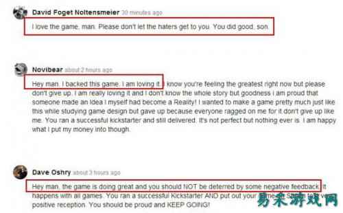 Kickstarter支持者评论 Farjay在结尾时表示,“我做PC游戏开发一定是错了,因为很难保持快乐和有效工作的状态。”也就是说,作为一个新入行的开发者,Farjay似乎对于刻薄的评论以及言语攻击还不够适应,作为独立开发者,创造游戏的能力和心理承受力往往并不一定是同时存在的,对于这种情况,我们也只能表示惋惜。 博文发布之后,Kickstarter平台的绝大多数支持者们纷纷对开发者表示支持,很多粉丝希望Farjay不要被负面评价所影响,因为他“已经做了非常不错的游戏”。 |