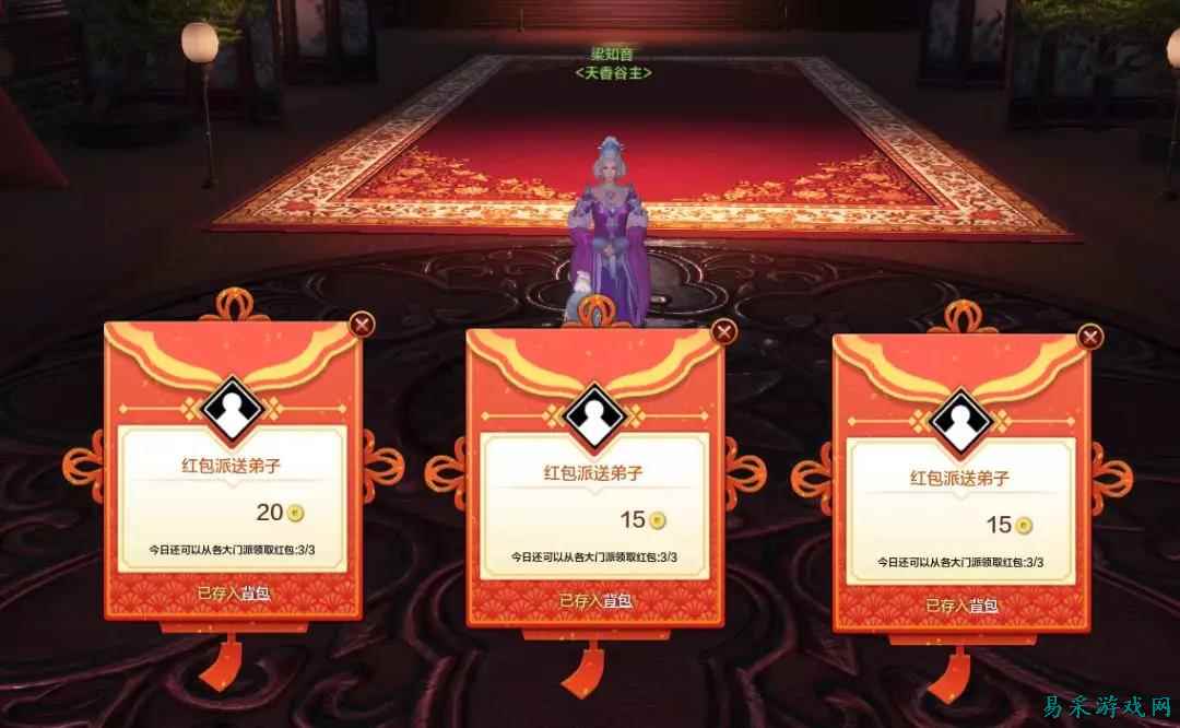 萌趣冰雕等你玩 4门派写春联 1月15日-1月26日,春节没春联怎么行!完成所有门派春联,将获得3个春节限定举春联动作! 5围观讨红包 悄悄告诉少侠,听说今年--唐青枫找叶知秋叶盟主要红包啦!不一样的套路会有怎样的结局?讨红包攻略快来游戏里看看吧! https://v.qq.com/x/page/r30512its0c.html 围观讨红包视频(内含剧透) 6新年压岁钱 1月25日-2月7日,春节别忘了回门派拜年呀!各掌门已经准备了压岁钱,正在盼望少侠回家呢!