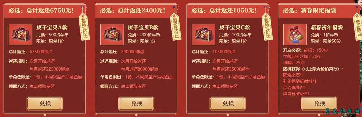 7开工利是 大年初七(1月31日)登陆,还有开工利是等你领,5000绑点送送送! 新春大促 祈年·庚子 新春大促今日同步开启!不仅有双倍天赏&限时折扣来袭,祈年·庚子活动更有一亿绑点等你瓜分! 双倍天赏 限时折扣 新春大促今日开启!海量历史商城商品,限时折扣低至4折!吟风系列载具全场6折!购买点券类限时折扣商品,还可享受双倍天赏积分福利! 祈年·庚子 十倍返利 新春祈年,奖励升级!赢签王,享好礼!拥有签王的少侠可以向游戏好友发送祈年祝福噢!