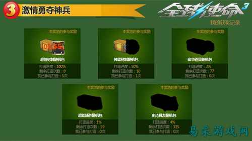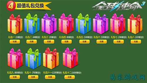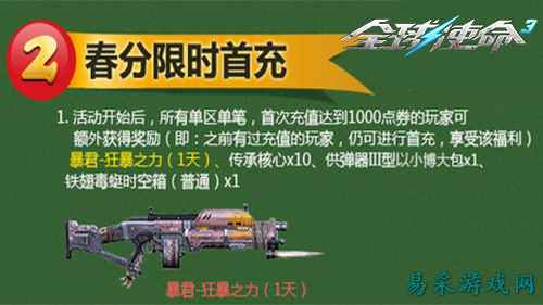 活动期间,单区充值1元即可获得4点充值积分,充值越多,得到的积分越多。值得一提的是,关注“全球使命OL”微信公众号并成功绑定账号可额外获得40积分哦!积分可用于官网活动页面的“激情拉霸”,每使用160积分即可拉霸一次,拉霸后有几率获得稀有装备、顶级神器。玩家累计拉霸十次,第十一次拉霸必得超能暴君神器,并额外赠送“暴君-熔岩爆裂”。除此之外,消耗积分排名前十的用户可获得“积分排名礼包”,排名第一的用户则有机友时空箱、暴君芯片、Lv6机友插件等丰富礼包。 活动开启后,无论你以前是否有过充值记录,活动时间内的第一笔充值都能算作首充。所有在《全球使命3》单区单笔首次充值1000点券的玩家,即可获得一份豪华礼包,内含暴君-狂暴之力、机友铁翅毒蜓时空箱以及材料道具。所有奖励将通过游戏内邮件的方式即时发送给玩家,请注意查收。 活动期间,充值获得的积分可参与活动页面的“激情勇夺神兵”。玩家可通过消耗积分打造材料、道具随机包,当剩余可合成次数为0后,系统会根据你的打造进度生成随机包,随机包合成进度越高,获得道具的概率就越高,若随机包合成进度为100%,玩家就可直接所选中的材料、道具。 除此之外,积分也可直接兑换活动页面的12个超值礼包,礼包对应不同的道具材料,更有永久时装“龙之传人”、“凤之传说”兑换!请玩家在活动期间及时兑换,我们将在活动截止时关闭兑换通道,届时所剩余的积分会被清除。限时超值礼包齐亮相,十二礼包加成让你变身国联精英! 万紫千红总是春,超能暴君拉霸开!全视角PVE射击网游《全球使命3》新版本“山村老屋”已上线!这里有最震撼人心的科幻战争场面,最具特色的全视角真实动作射击作战及各种极具深度、热血刺激的PVE玩法。欲获知更多最新游戏情报欢迎登陆游戏官网或关注《全球使命3》官方微信号及官方微博! |