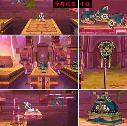 副本内的小怪种类不多,但是数量繁多,并且攻击力强悍,是绝对的实力选手。他们可以发射长射线进行大范围打击,也可以阻碍玩家的移动。在副本的关卡设置中,特定关卡会显示3种不同颜色的物体,每种颜色的物体对应不同的关卡,玩家破坏物体后进入下一关卡,其中绿色物体关卡内会有小BOSS登场,选择顶部带有标志的物体关卡时,可以获得更多的奖励噢!