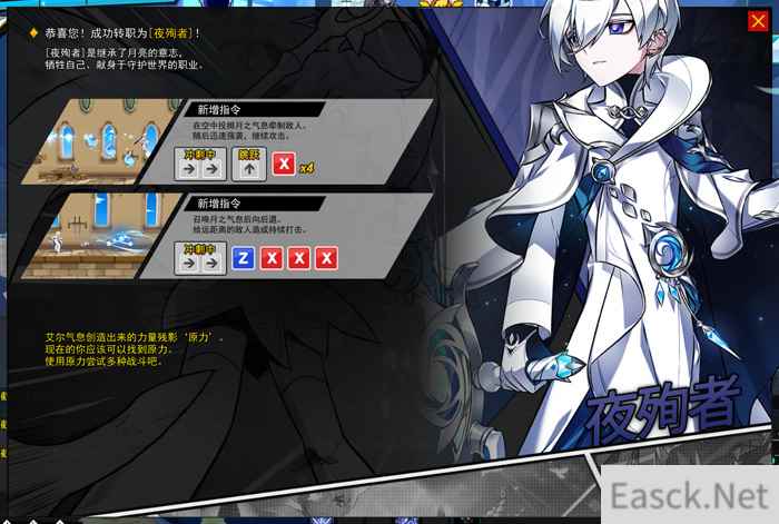 第3分支三转职业“夜殉者” 背景故事:自由操纵满溢的月之力的银月殉教者。 无论反复多少次,都还是无法同时拯救所有人。 察觉到机会已经所剩无几的诺亚停止了回归。 在经历过无数次死亡之后,诺亚放弃了一切,朝着通往过去的遗物前进。 在过去的伊贝伦家中,看着极力隐藏痛苦、倾尽所有疼爱自己的哥哥的影子后,诺亚下定决心以哥哥所希望的模样继承哥哥的意志。