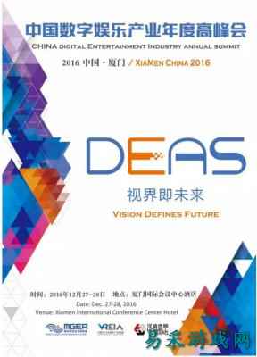 2016年中国数字娱乐产业年度高峰会(DEAS)将于2016年12月27~28日在厦门国际会议中心举行。本届年会以“视界即未来”为主题,倾情回顾2016数字娱乐产业发展态势,精心盘点2016数字娱乐产业热点,深入解读2016数字娱乐产业现象,权威预测2017游戏以及VR、泛娱乐全新动向。