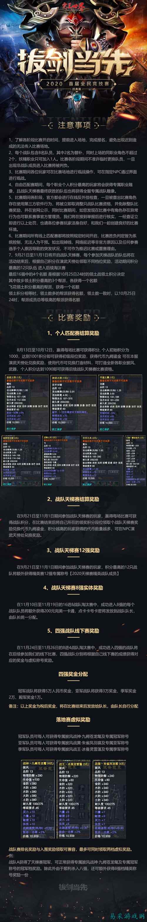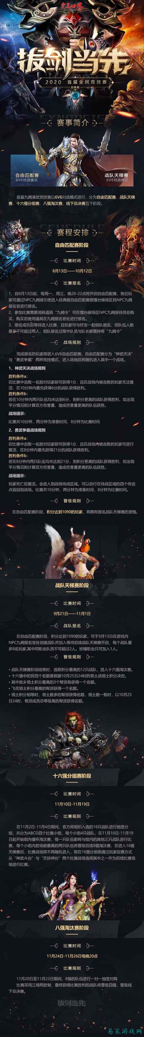 (九阙演武场) 【首届经典服全民竞技赛即将打响】 首届经典服全民竞技赛将于8月17日打响首战,比赛以6V6对战模式进行,分为自由匹配赛、战队天梯赛、十六强分组赛、八强淘汰赛、线下总决赛五个阶段。参加比赛的勇士在每个阶段都可以获得对应的奖励,四强战队还将参加官方组织的线下比赛,并根据线下赛成绩获得对应的比赛奖金及珍贵游戏道具。