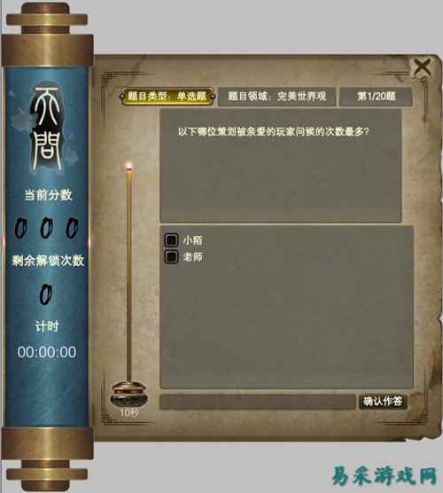 (天问·寻根究底) 完美勇士需经过“天问”四阶段的考验,来证明自身的博闻才识,分别是“天问·寻根究底”、“天问·坤舆阵图”、“天问·起而论道”和“天问·祖龙激辩”。过关斩将者将获得专属属性称号和可以兑换丰厚奖励的“天问·古卷”。