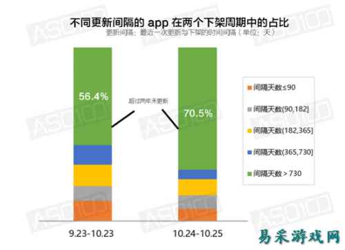 下架app多为废弃应用 对比近一个月(9月23日至10月23 日)的数据,App Store共下架 app 137607 款,每天的平均下架数量在 4500 左右,远小于最近两天的2~3万。ASO100对这些下架 app 的特征进行了数据统计,发现最近两天下架的 app 中,有 70.5% 的 app 两年未进行更新,这个数据要高于同样的 app 在前 30 天的所占比例 56.4%。