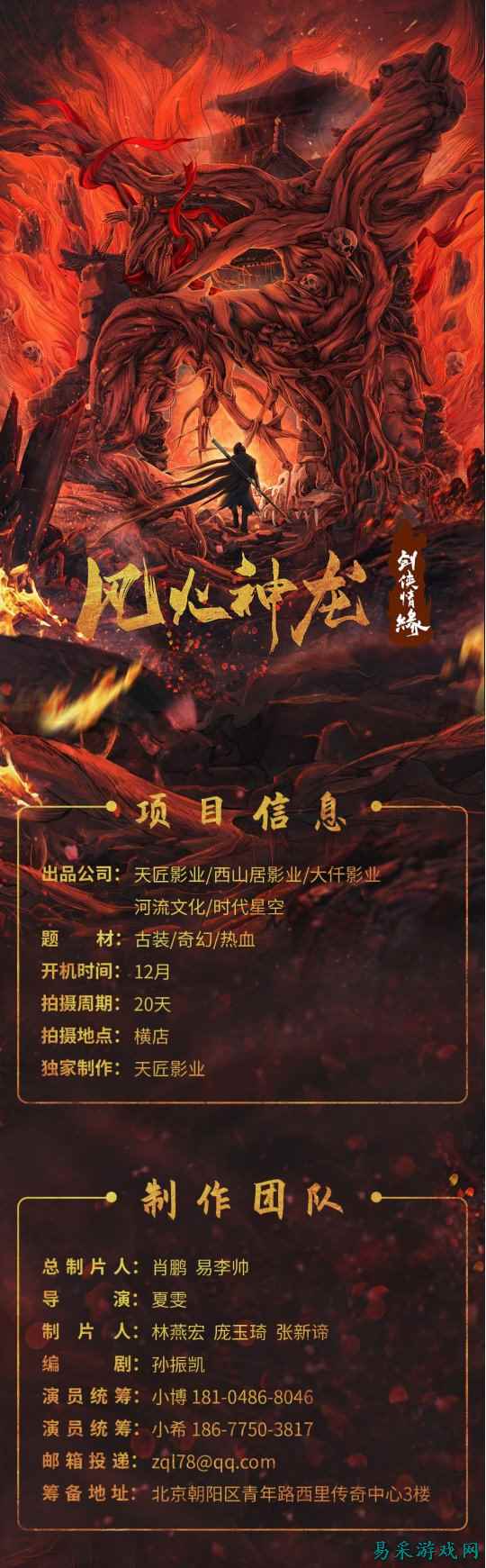 真人网络电影《剑侠情缘之风火神龙》讲述了一个草根出身的丐帮弟子郭岩,一直想要成为为丐帮争光的、众人口中的“大侠”,却在经历一系列误会、欺辱、诱惑、绝望后,依然选择站在公平和正义的一面,最终领悟“侠义”的真谛,成为人们口中“风火神龙”的故事。影片组讯信息已经发布,计划于2020年12月开机。