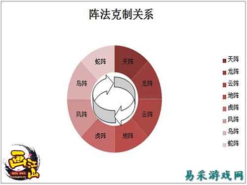 阵法之间也是有克制关系的,一种阵法在遇到克制阵法时会有额外加成,遇到不利阵法时则会有减成。所以在战斗中如果能选择克制对方的阵法的话,将会带来很大的优势;而如果你方的阵法不巧被对方克制,那么本来轻松就能取胜的战斗可能就会变得非常艰难。