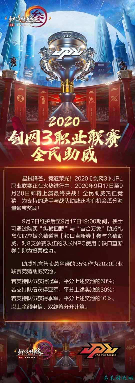 【职业联赛巅峰决战 全新应援道具曝光】 与此同时,2020剑网3JPL职业联赛近日也为侠士们带来了一场场热血的竞技盛宴,而9月17日至20日便是本届JPL联赛的巅峰决战时刻!2020剑网3JPL职业联赛助威礼盒“纵横四野”与“宙合万象”也于今日抢先上线!侠士们可选择自己心仪的助威礼盒进行购买,礼盒内不仅有可应援支持战队的应援道具“铁口直断券”,还将获得十五门派特效武器“芙蕖醉影”系列道具与拓印资格,以及新纪念版动态小头像礼盒“大衍之韵”!接下来就让资讯君带大家一睹本次“芙蕖醉影”系列特效武器拓印的真容吧! “芙蕖醉影”系列十五门派全特效武器拓印展示视频: