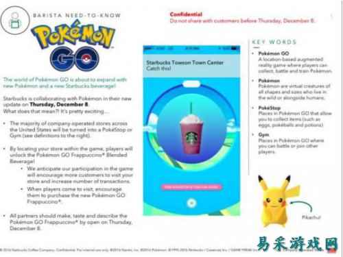 近日,有外媒报道《精灵宝可梦GO》开发商将和星巴克达成合作伙伴关系,在星巴克抓精灵能够提升捕捉精灵的几率,还有机会获得专属饮料。 有人在 Reddit 泄露了一份星巴克内部文件,文件中显示,从 12 月 8 日开始,全美几乎每一家星巴克都会变成游戏中的 PokeStop 或者道馆(除了少数几家因为 Niantic 端的技术原因不在列之外)。 这次活动中,星巴克也会推出相关特饮“宝可梦星冰乐”,其中含有覆盆子和黑莓,似乎是在映射游戏中的莓类道具。文件中还包含对员工们制作特饮的指导。