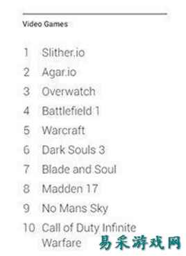 而在谷歌公布的2016年度PC游戏领域最热门搜索词排行榜,前三甲不是游戏续作或3A级大作,而是两款网页游戏和《守望先锋》。 谷歌公布的2016年PC游戏热搜榜前两位是两款网页游戏《蛇蛇大作战》(Slither.io)与《细胞吞噬》(Agar.io)。两款游戏都非常简单,玩家可以在线与多人对战。事实上“Agar.io”去年就在谷歌的2015全球热门搜索关键词上位居第三,今年依旧延续其火热势头。 暴雪全新的团队射击游戏《守望先锋》则在今年的游戏热搜榜上排行第三,这对一部全新的游戏系列来说意义非凡,是一项了不起的成就。此外,暴雪的《魔兽世界》也位居第五,而Ncsoft的《剑灵》也排在第七位。 由于国内并未有谷歌的搜索业务,因此这个榜单只能反映海外玩家的PC游戏偏好,国内的PC游戏排行肯定与之有不小的出入。 谷歌2016年度PC游戏热搜榜前十名: 1 《蛇蛇大作战》(Slither.io) 2 《细胞吞噬》(Agar.io) 3 《守望先锋》(Overwatch) 4 《战地1》(Battlefield 1) 5 《魔兽世界》(Warcraft) 6 《黑暗之魂3》(Dark Souls 3) 7 《剑灵》(Blade and Soul) 8 《麦登橄榄球17》(Madden 17) 9 《无人深空》(No Man’s Sky) 10 《使命召唤13:无限战争》(Call of Duty Infi nite Warfare) |