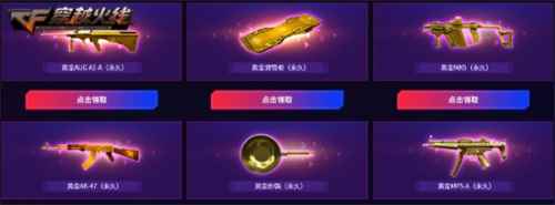 稀有黄金 指定时段游戏即得 10月17日的15点左右,CFer参与任意游戏1局即可任选1件稀有黄金武器进行领取。而玩家在19点左右参与游戏1局,则有机会限时抽取到AK47-圣诞节[2019](永久)、MK5-圣诞(永久)、马来剑-圣诞(永久)等趣味圣诞武器。