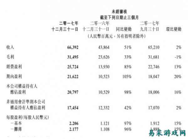 第四季度总收入663.92亿元,同比增长51%;公司权益持有人应占盈利为207.97亿元,同比增长98%。