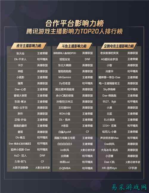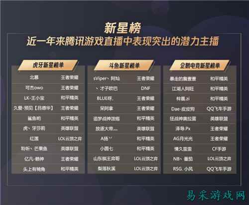 目前平台的素材库功能,可以让主播和内容作者方便快捷地获得更多优质的素材进行延展,主播还能免费及时获取自身高清直播精彩视频素材,从源头层面保证了内容的及时性和丰富性;其次,通过腾讯在AI领域多年沉淀的技术嫁接,实现在平台上的智能创编,辅助内容作者,助力更多闪亮的想法得以实现;最后,基于腾讯生态+内外部分发渠道的联动优势,保护优质内容的渠道分发安全性,并让优质内容传输实现“最后1公里”触达,被更多的用户看到。 未来,腾讯游戏将会聚焦主播生态,全方位通过资源扶持 +赋能创作双轨并行,帮助更多主播获得资源上、商业化上的提升,不断通过产品与资源落地,打造腾讯游戏“大直播时代”。 我们将会以季度为单位持续发布官方榜单,敬请关注!也欢迎更多的优秀主播加入腾讯游戏认证计划。 附:影响力榜与新星榜