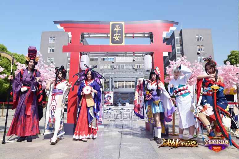 式神现世大学城,还原平安京唯美战场 武汉海选赛现场搭建平安京鸟居和樱花树,高度还原游戏内景。现场还请来人气式神Coser,为海选赛战队成员加油助阵。现场不仅成为紧张而激烈的平安京战场,更是一次唯美的平安京实景展出。