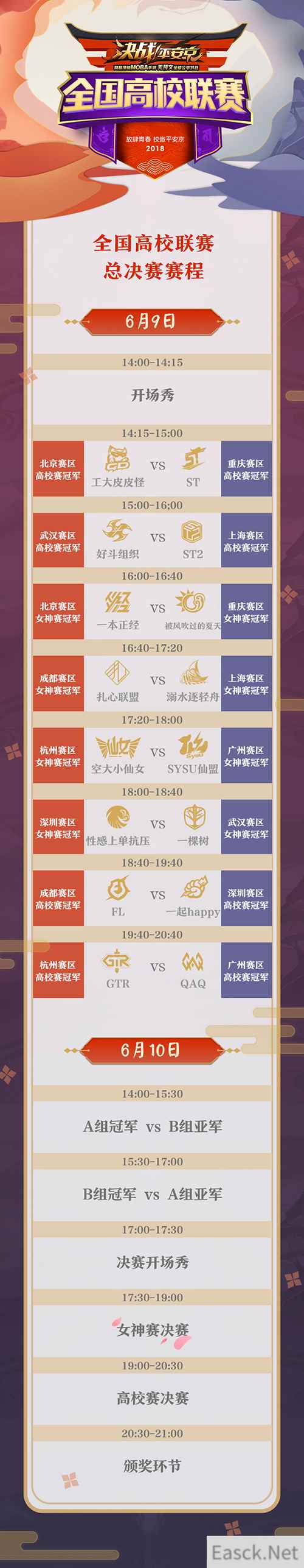 6月9日及10日,《决战!平安京》“全国高校联赛”全国总决赛将在北京五棵松体育馆M空间正式开幕,高校女神赛总决赛也将在这期间同步举行。届时,八支校园战队也将在灯光璀璨决赛舞台上,展现自己的全部实力,为所有阴阳师大人们带来最精彩激烈的对战盛宴! 决赛赛程公布,共同见证冠军诞生 强强对擂,谁与争锋。明天下午14:00,高校赛全国总决赛将准时开战,比赛也将迎来最后的高潮。八支校园战队将随机分为AB两组,每组四个队伍,进行BO2单循环小组积分赛,各组冠亚军将成为四强晋级6月10日的淘汰赛。而女神赛则将采用BO1单败淘汰制,决出女神全国四强。 6月10日即后天,高校赛与女神赛四强都将采用BO3单败淘汰制,角逐出最终的冠亚季军。究竟哪支战队能够笑到最后,成为平安京最强校队?谁又将凭借实力,夺得女神桂冠,终极决战来临,你我一同见证!