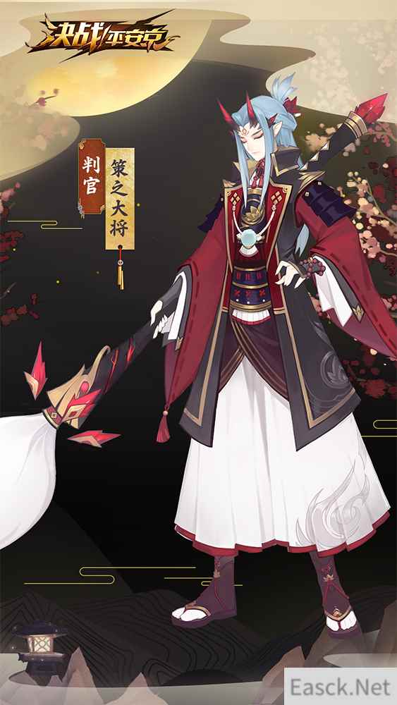 绯色的锐利鬼角映衬着灰蓝色的长发,那合上的双眼却充满了宁静。虽目不能视,却能通晓战局,判官着一身赤红战衣,于军营中书写着致胜秘策。红笔赤墨,胜券在握,挥笔的刹那,如同统帅着百万雄兵的绝世军师,在将胜负决定在了千里之外。
