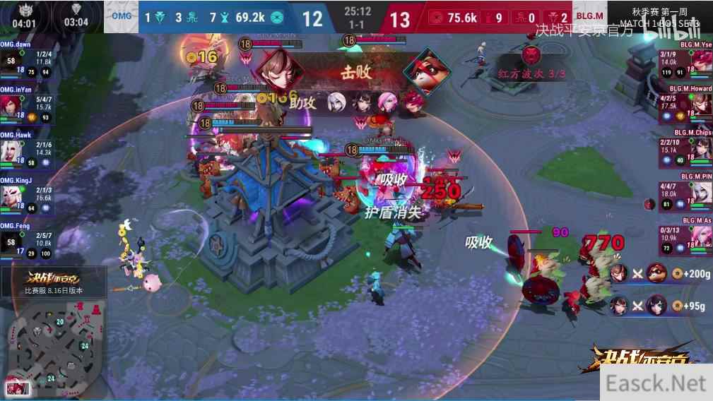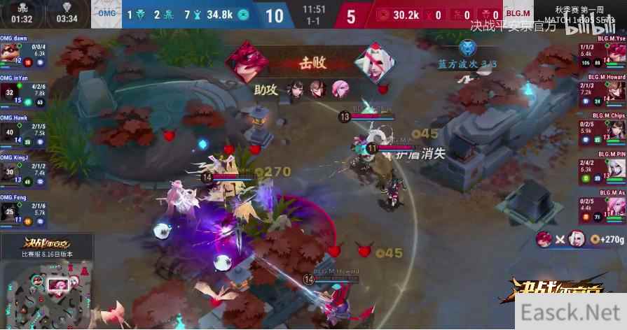 比赛进入到快12分钟,BLG.M在自家高地门口防守,BLG.M.Yse鸦天狗控到OMG方4人,导致OMG团战阵型散开,BLG.M队员趁机抓死夜叉和妖狐,打出一波0换4的团战,拿回一些经济并再次寻找机会,重整旗鼓。