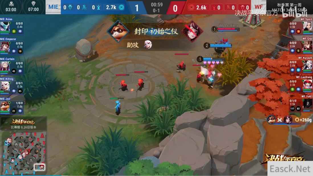WF展现全新面貌,以3:0利落击败 MIE WF和MIE的新兵之战也是非常令人期待的一场对决。MIE在ODL登顶后,在升降赛击败GH和JCR,站上OPL的舞台。WF这支队伍则是在春季赛成长迅速,击败过TOT、LP,而这次秋季赛的新队员则是来自于ODL的亚军队伍TOC,同样也是实力不俗。 第一小局WF多次主动开团,率先拿下一分。比赛进入到第二小局,双方BP环节相比第一小局,下路组合是进行了互换。WF选择玉藻前搭配小松丸,更偏于打后期的阵容。MIE则是换了另外一个套路,拿出了傀儡师让经济给荒川,针对对面下路可以给到更多干扰和压力,是偏前中期选择上更多元的阵容。