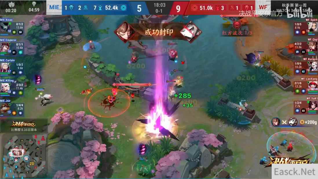 开局一分钟,MIE.Jsir狸猫发挥前期优势,击杀WF.Yok1桃花妖,但随后被WF中野一波输出拉回人头数。