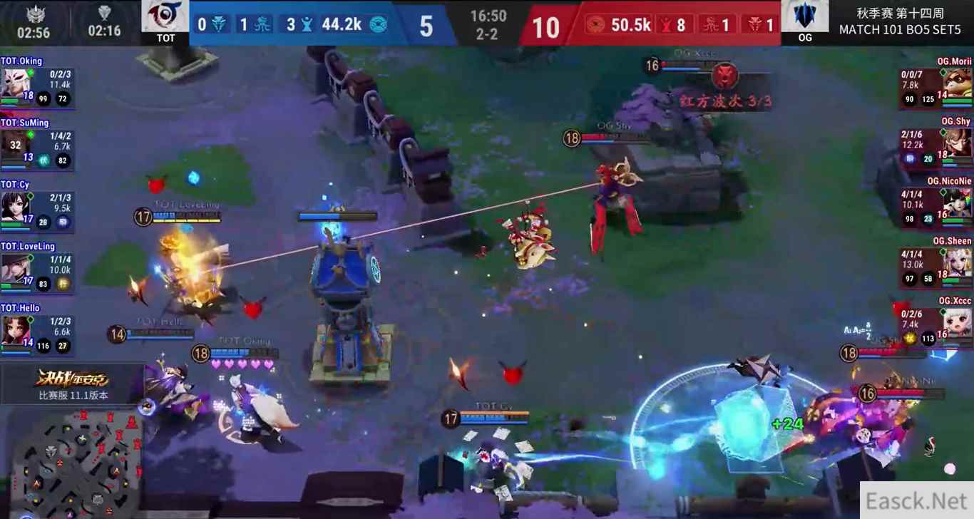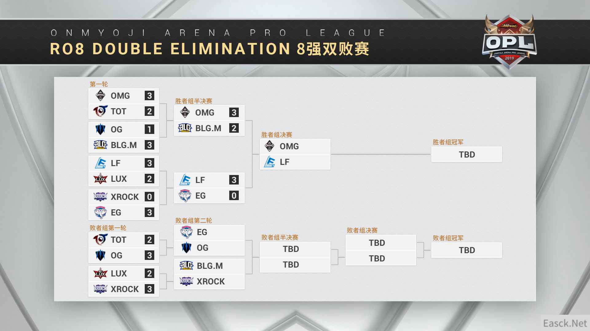 TOT-OG:破釜沉舟,相战相惜 败者组淘汰赛,TOT迎战卫冕冠军OG。TOT再次展示了强大的实力,只可惜棋差一着,战满五局惜败于OG,成为季后赛中首支离开OPL舞台的队伍。第一局TOT先声夺人,凭借两条大蛇的优势赢得首胜。第二局OG四一分推取得成效,扳平比分。第三局TOT两波大蛇大获全胜,先行拿到赛点。第四局OG背水一战,开启莽夫模式再度扳平。决胜局OG利用兵线优势,小袖之手偷塔险胜,挺进下一轮。