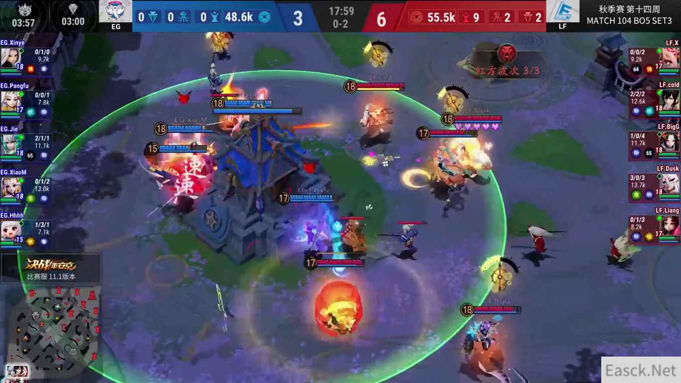 LF-EG:LF坚韧老道,王者归来 LF以3:0的大比分击败EG,但过程并不轻松。首局LF通过两波大蛇团战建立优势,一波兵线直取大营。第二局EG拿下两条大蛇,但LF顶住兵线压力拖到第三条大蛇,凭借阵容后期恐怖输出再下一局。第三局cold选出招牌万年竹,灵活分带让EG不厌其烦,最终三路百鬼线一锤定音,杀入胜者组决赛。