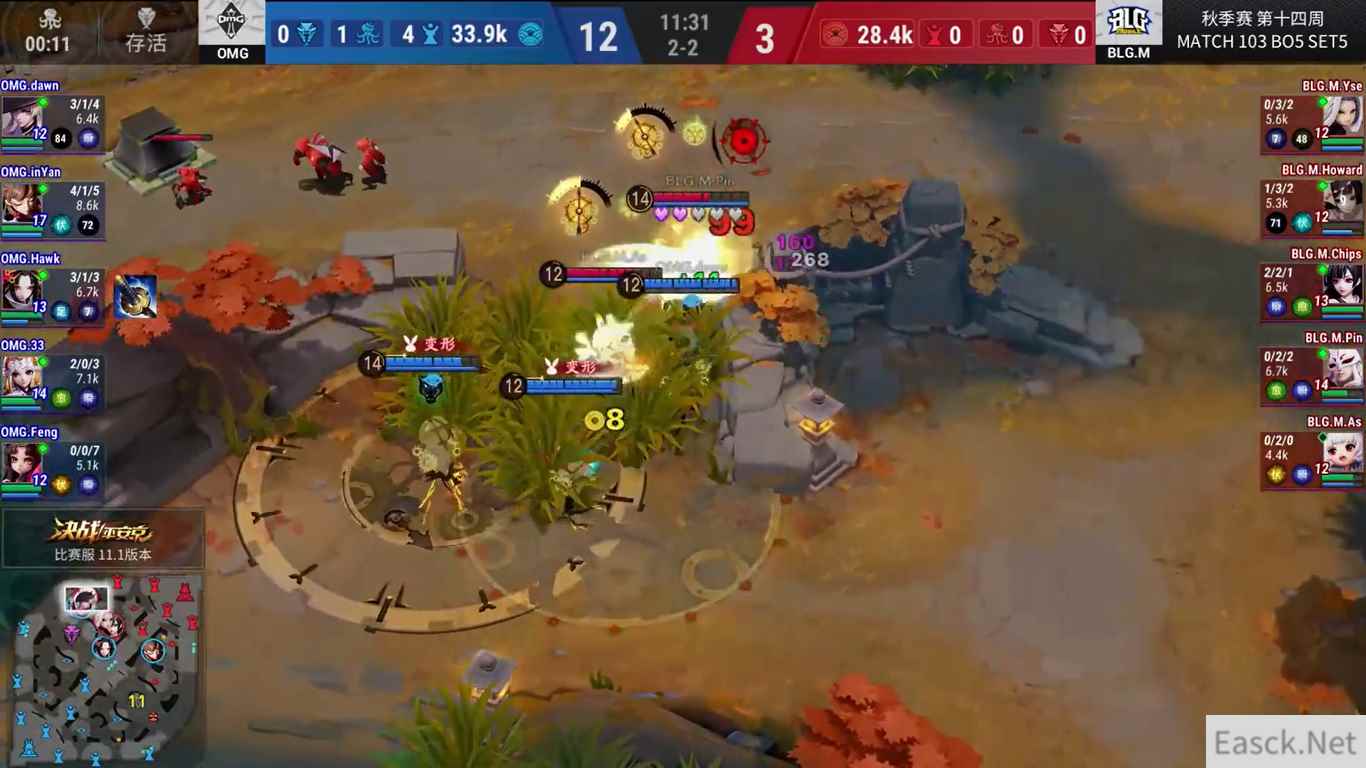 OMG-BLG.M:兵急如风,速战速决 OMG和BLG.M虽然拉满五场,但每一场都是速战速决。第一局OMG掌控局面,拿下首条大蛇后一波获胜。第二局OMG如法炮制,迅速拿到赛点。第三局BLG.M大蛇团打出0换4,扳回一城。第四局BLG.M抓住OMG失误机会,一波反打拿到赛点。决胜局OMG打野全面压制对方,丢失节奏的BLG.M无力抵抗,遗憾落败。