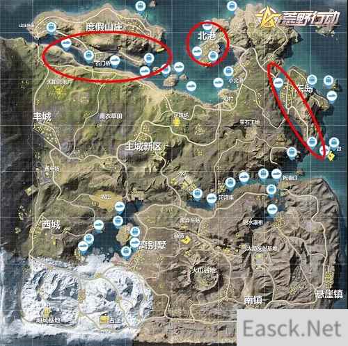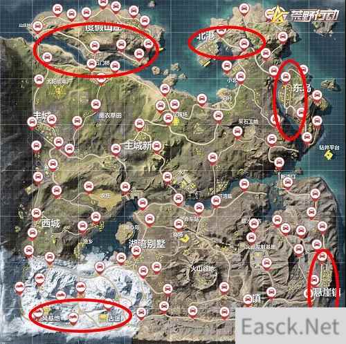 但是,地图边缘区域往往远离安全区,需要跋涉很长距离才能赶到信号圈内,因此交通问题是最值得考虑的。这时候熟悉载具位置,借助载具实现快速转移就显得格外重要。从载具资源分布图可以看出,地图北部的边缘区域,交通相对来说会比较便利,除了车辆资源较多以外,船只资源也较为丰富,可选择性多。