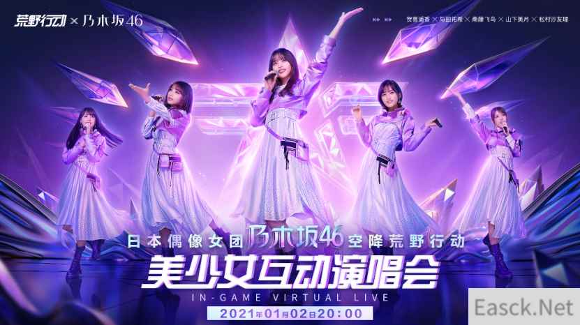 在演唱会地图现场,玩家可以免费拾取获得丰富的游戏道具,更可以近距离观看乃木坂46美少女成员们的Live表演,与她们一起进行互动!演唱会现场可开启音游模式,玩家可跟随旋律和鼓点,敲击对应的符号,与成员们齐跳舞蹈。挥动应援棒打call也是演唱会的必备环节,让你支持的小偶像接收到你的应援!届时,游戏内更有限时活动开放,玩家参与即有机会获得永久联动道具! 北京时间2021年1月2日晚20点,玩家可准时上线《荒野行动》手机或PC,通过游戏内活动入口进入演唱会现场地图观看!千万不要错过! |